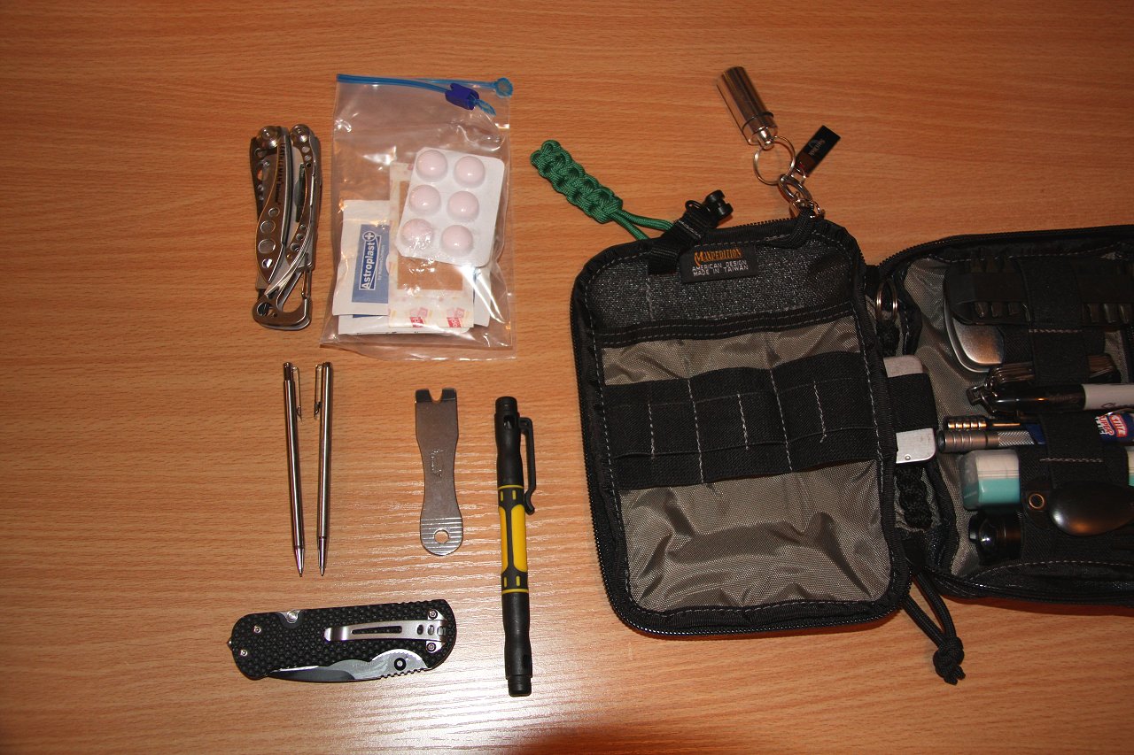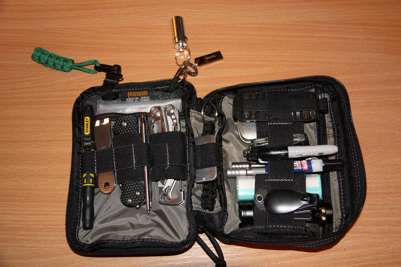 The first step was to abandon the tin idea for the reasons already mentioned. I don’t carry the EDC on me at all times so it just needs to be at hand, either in my rucksack, car or even the office drawer. Having seen articles and videos showing the use of Maxpedition pouches they seemd the ideal EDC pouch. I opted for the Maxpedition Fatty Pouch in black which is at the larger end of the range but gives a nice flexible selection of compartments.